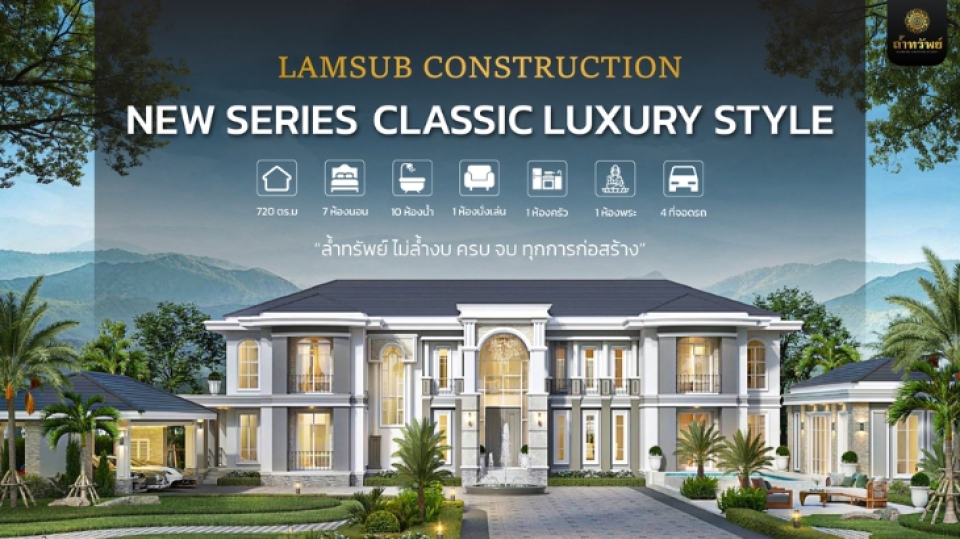 ล้ำทรัพย์คอนสตรัคชั่นขอแนะนำแบบบ้านใหม่ในซีรีส์ Classic Luxury Style แบบบ้านที่ออกแบบมาเพื่อตอบโจทย์การอยู่อาศัยระดับพรีเมียม ผสานความหรูหราเหนือกาลเวลาเข้ากับฟังก์ชันการใช้งานที่ครบครัน เหมาะสำหรับครอบครัวขนาดใหญ่หรือผู้ที่ต้องการพื้นที่ใช้สอยอย่างเป็นสัดส่วน